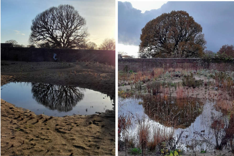 Besides all the benefits the ephemeral pond provides for wildlife and the contribution it makes to the mosaic structure of the garden by providing yet another microclimate and community of plants – it is beautiful. Whether we’re watching a thousand bulls-eye rings form from every leaping rain drop or seeing the sunset behind the Knepp oak beyond the garden wall reflected in the mirrored water, it’s all the more precious for being temporary and unpredictable.