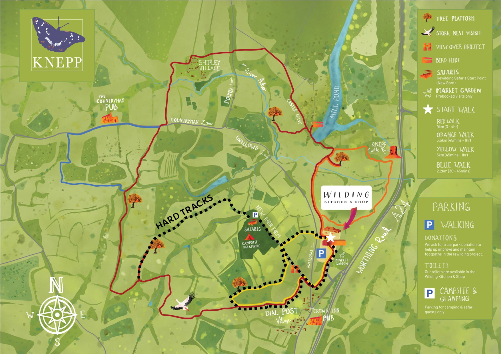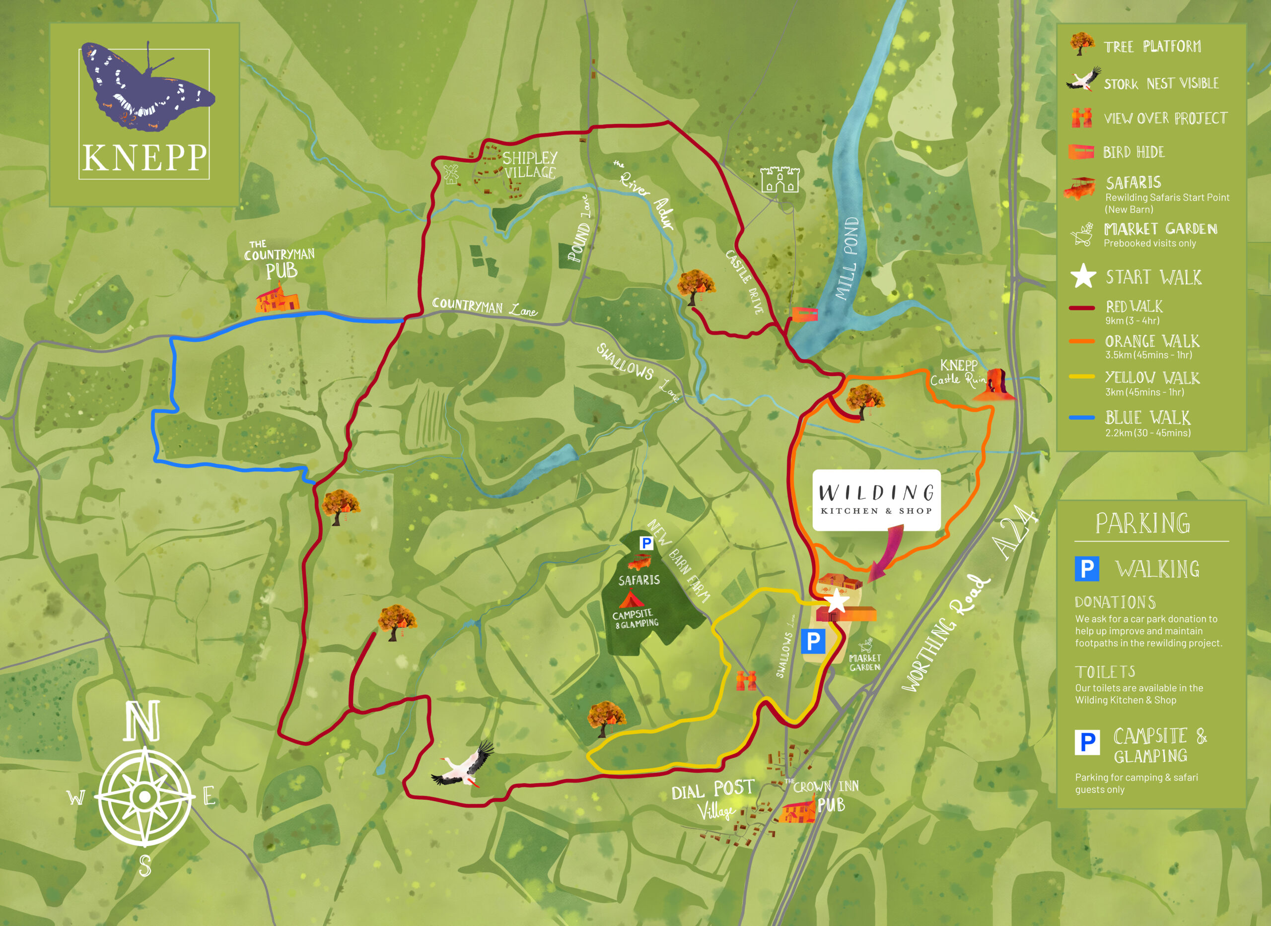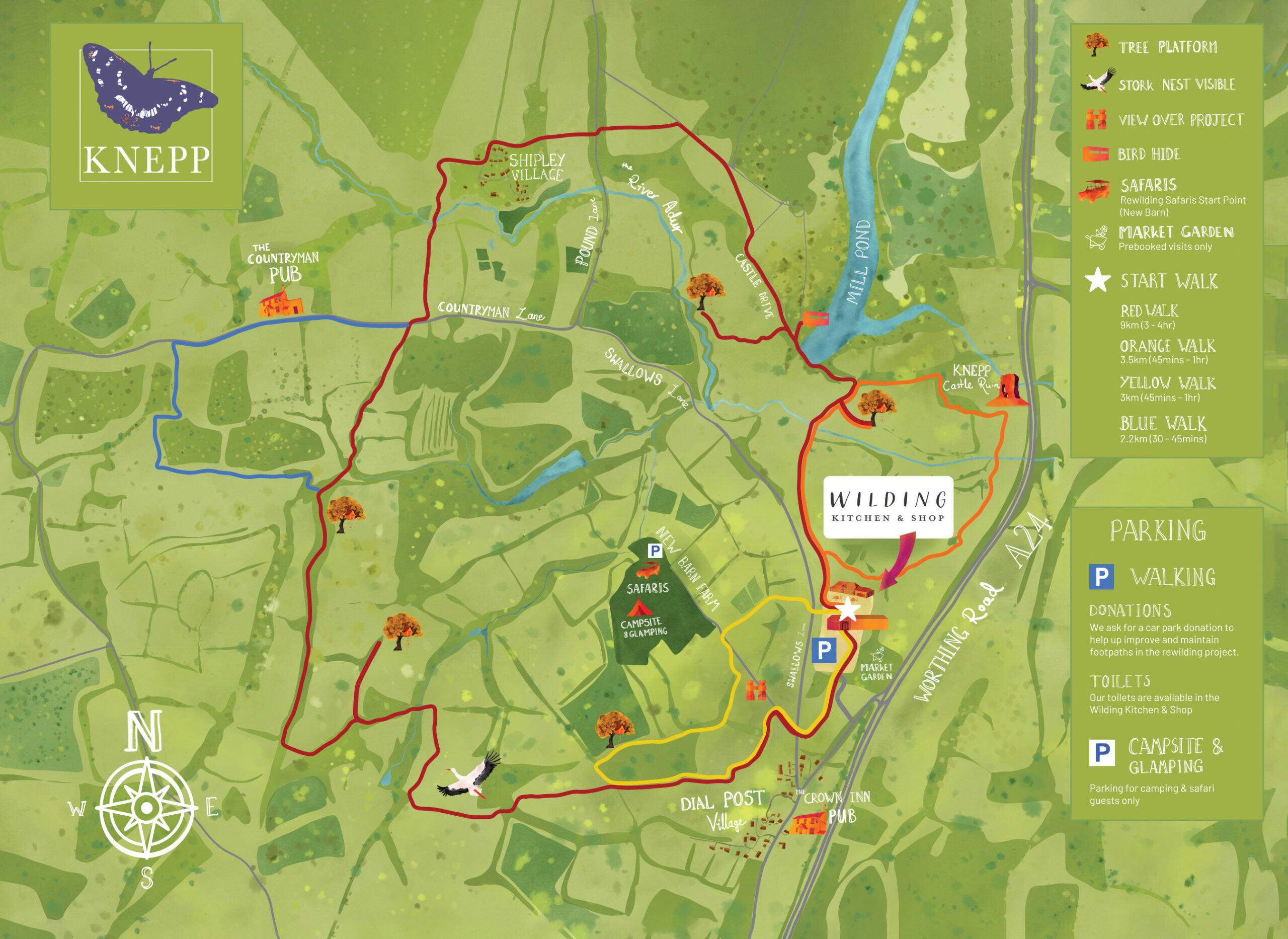 There are 16 miles of walks at Knepp within the rewilding project, with five tree viewing-platforms, close to public footpaths, offering panoramas of the surrounding countryside, and a bird-hide overlooking Knepp Lake.