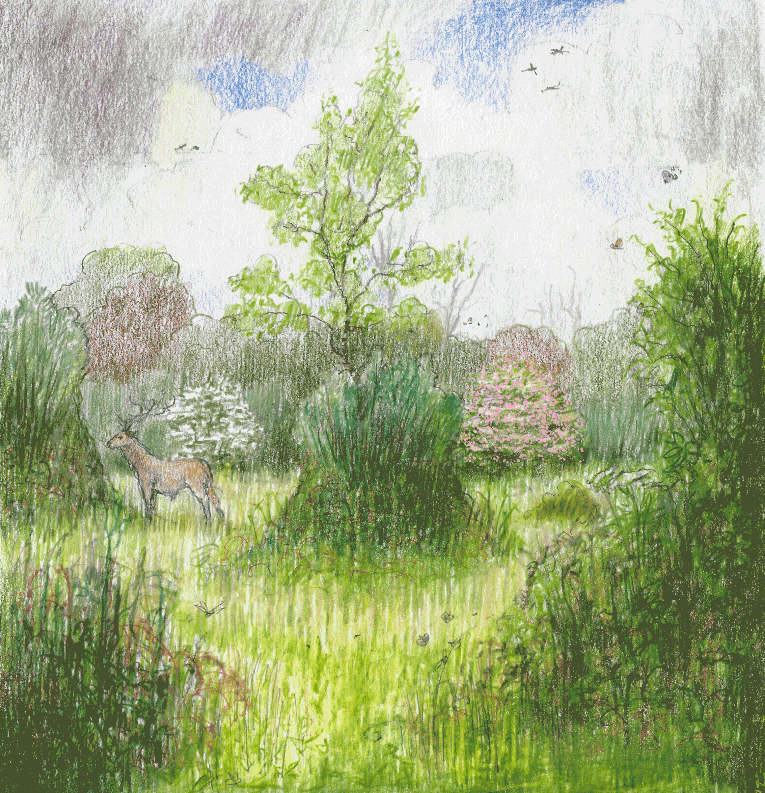 Our ecological engineers (pigs, cows and ponies) will support the establishment of naturally regenerating scrub. Scrub will increase habitat complexity, support wildlife, and connect woodland and grassland across the site. Our approach prioritises natural colonisation: